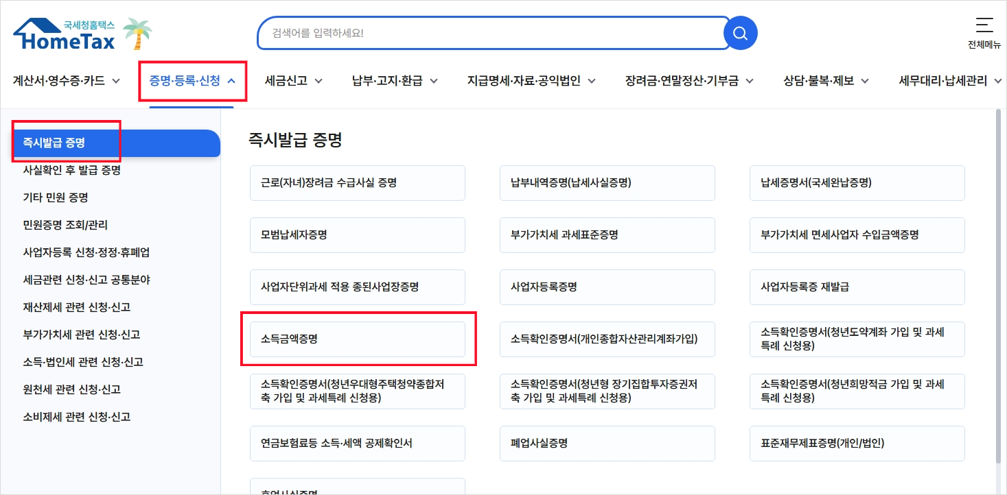 - 상단 메뉴 → 즉시발급증명 → 소득금액증명 클릭