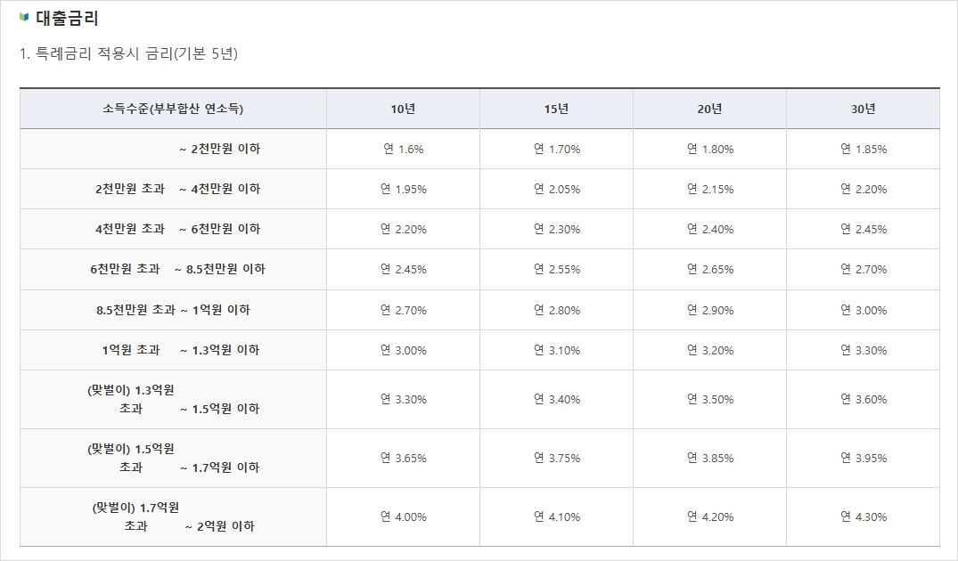 - 대출접수일 기준 2년 내 추가 출산한 자녀가 있는 경우, 추가 출산 자녀 1명당 특례금리 적용기간 5년 연장 가능하며, 최장 15년간 특례금리 이용 가능